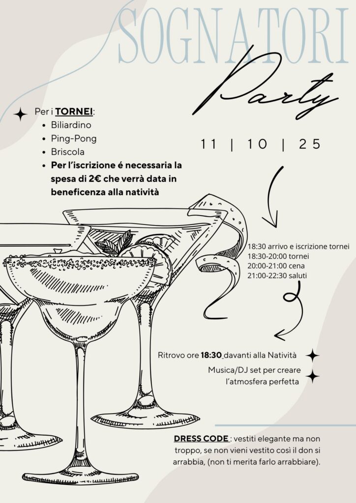 Ci ritroviamo tutti insieme per un Party, dove ci saluteremo, ci racconteremo le esperienze estive, giocheremo, parleremo e mangeremo insieme.